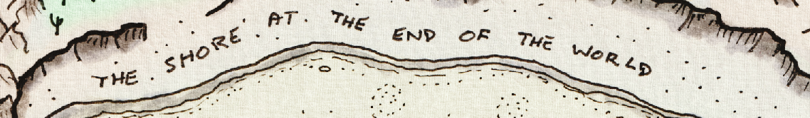 The Shore at the End of the World is hundreds of miles of rock and sand stretching almost the entire width of the continent of Vosh. It is bounded to the North by great sloping cliffs that reach a thousand feet or more up to the plateau that forms Bone City and the Undersands and into the foothills and low mountains of Hoard's Vault on the Eastern edge. From the base of the cliff the Shore stretches dozens of miles south to the edge of the Golden Sea, also known as the Sea of Sand and Stars: the vast expanse of liquified sand kept roiling and rolling in great waves by perpetual explosions of arcane energies.